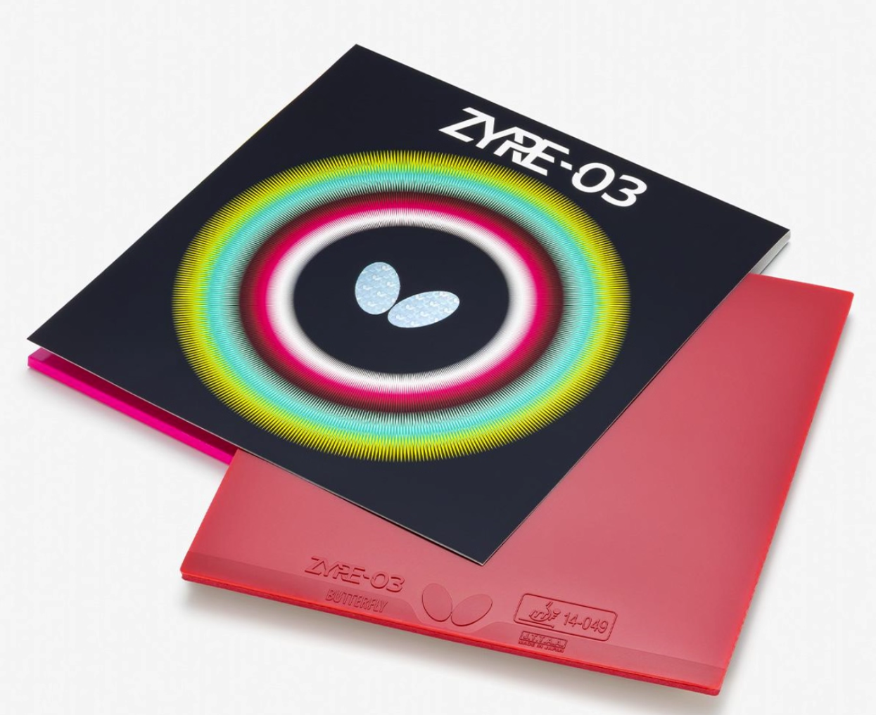 Butterfly Zyre 03 — это новая накладка для настольного тенниса от компании Butterfly, выпущенная в августе 2025 года, которая сочетает в себе продвинутый верхний слой Ricosheet и довольно жесткую губку Spring Sponge X для обеспечения высокой скорости, мощного вращения и мощной дуги атаки. Она разработана для игроков, стремящихся к контролю и мощи с высокой точностью и уверенностью.