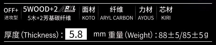 Шпон Koto средней твёрдости обеспечивает точное чувство мяча и уверенность в атакующей игре. Арилатное углеродное волокно стабилизирует крюк и обеспечивает ему большую зону наилучшего контакта. Кроме того, оно создаёт особые ощущения в руке, минимизируя вибрации и позволяя лучше чувствовать мяч.