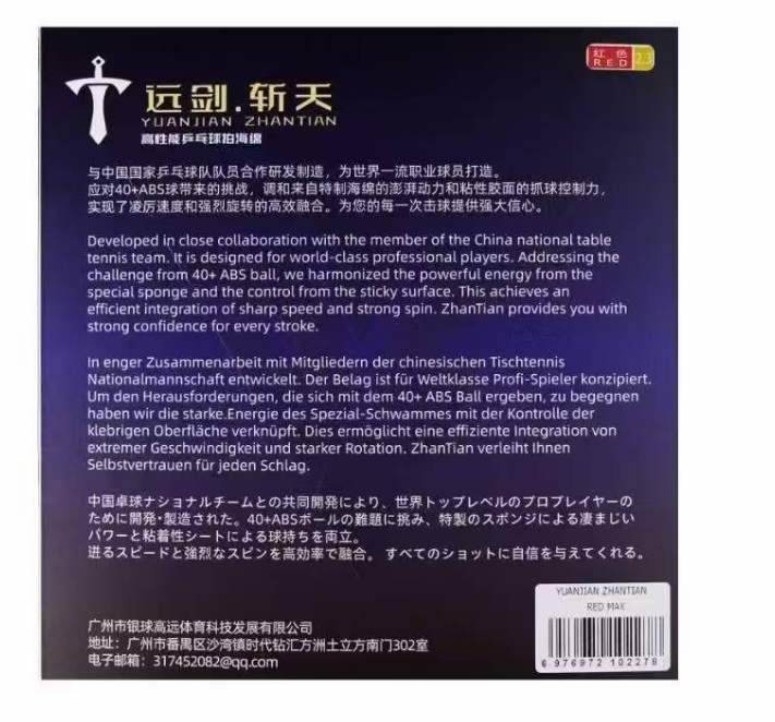 Накладка YUAN JIAN ZHANTIAN представляет собой результат гармоничного сочетания инновационных технологий и требований мирового класса. Она разработана для эффективной игры с новыми 40+ ABS мячами, обеспечивая мощную энергию от специальной губки и превосходный контроль от липкой поверхности. Это позволяет достичь эффективной интеграции высокой скорости и сильного вращения, даря игроку уверенность в каждом ударе.